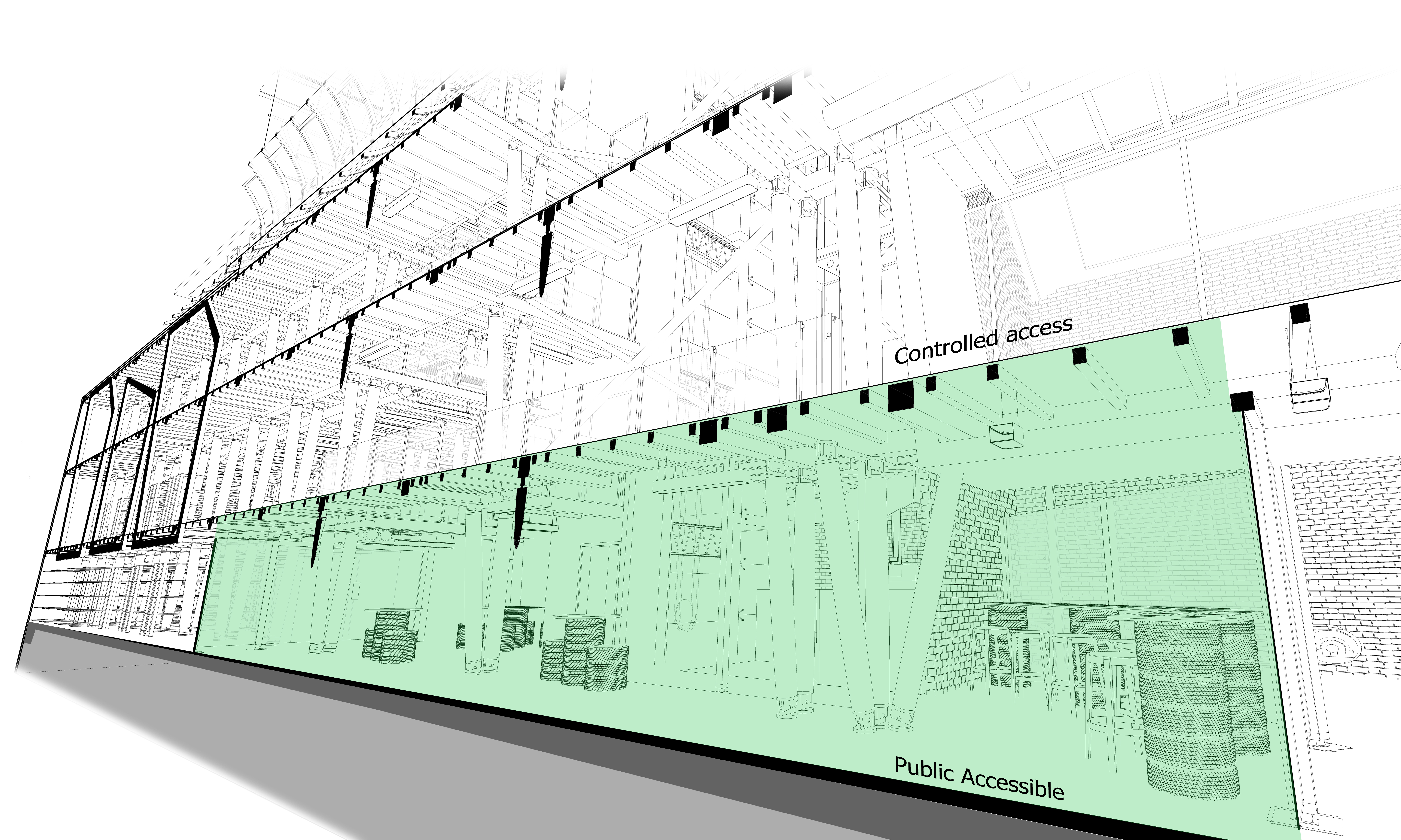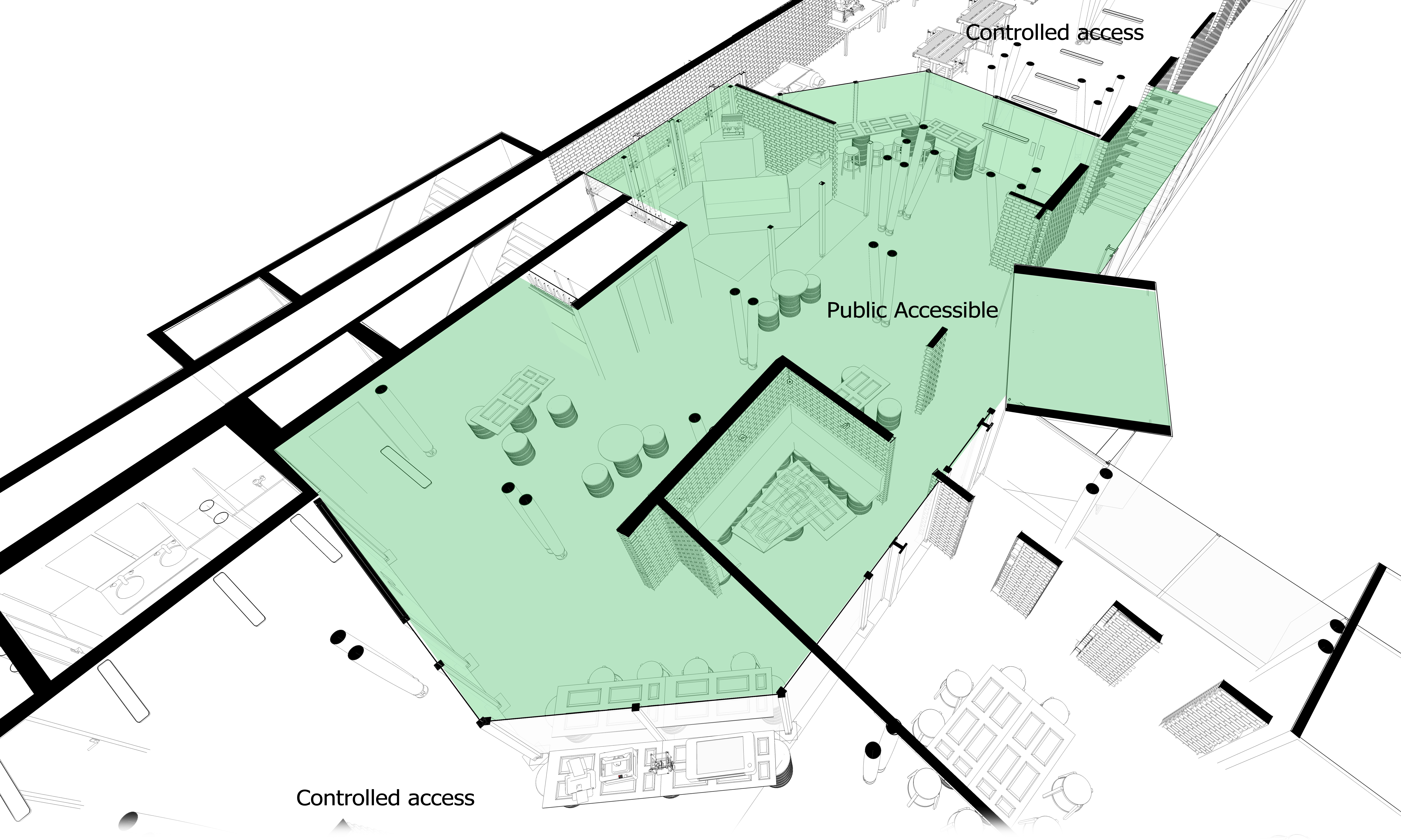 The building typology necessitates permeability with the public realm; within the building certain activities must be separated for safety and security of both public and users of the space. The images below show the areas that are public and controlled access. Please click on them to enlarge the image.